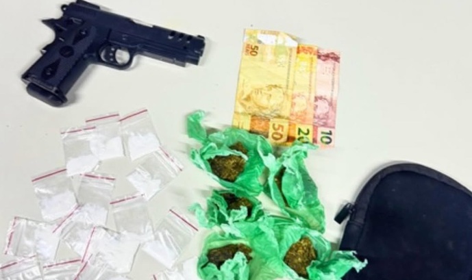 Diante da fundada suspeita, as equipes realizaram diligências imediatas e localizaram o indivíduo ainda na Praça de Eventos. Procedida a abordagem e busca pessoal, foi encontrado em sua cintura uma pistola de brinquedo. Em continuidade à busca, no interior de uma pochete que o suspeito portava, foram localizadas substâncias análogas à cocaína e à maconha, além de quantia em dinheiro, evidenciando indícios da prática do crime de tráfico de drogas.
