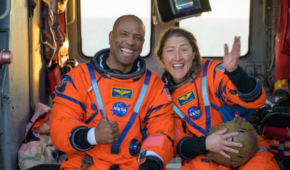 Após a chegada à Terra, os astronautas Reid Wiseman, Victor Glover, Christina Koch e Jeremy Hansen foram resgatados por um helicóptero e levados até um porta-aviões dos Estados Unidos, onde passam por exames médicos.