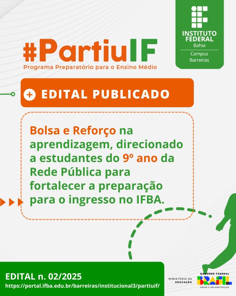 A Prefeitura de Barreiras, por meio da Secretaria Municipal de Educação, está mobilizando os estudantes do 9º ano do Ensino Fundamental da rede pública para participarem do PartiuIF, programa do Instituto Federal da Bahia (IFBA) voltado à preparação para o ingresso na Rede Federal de Educação Profissional, Científica e Tecnológica. O cursinho tem duração de oito meses e oferece uma bolsa mensal de R$ 200 para os alunos selecionados.