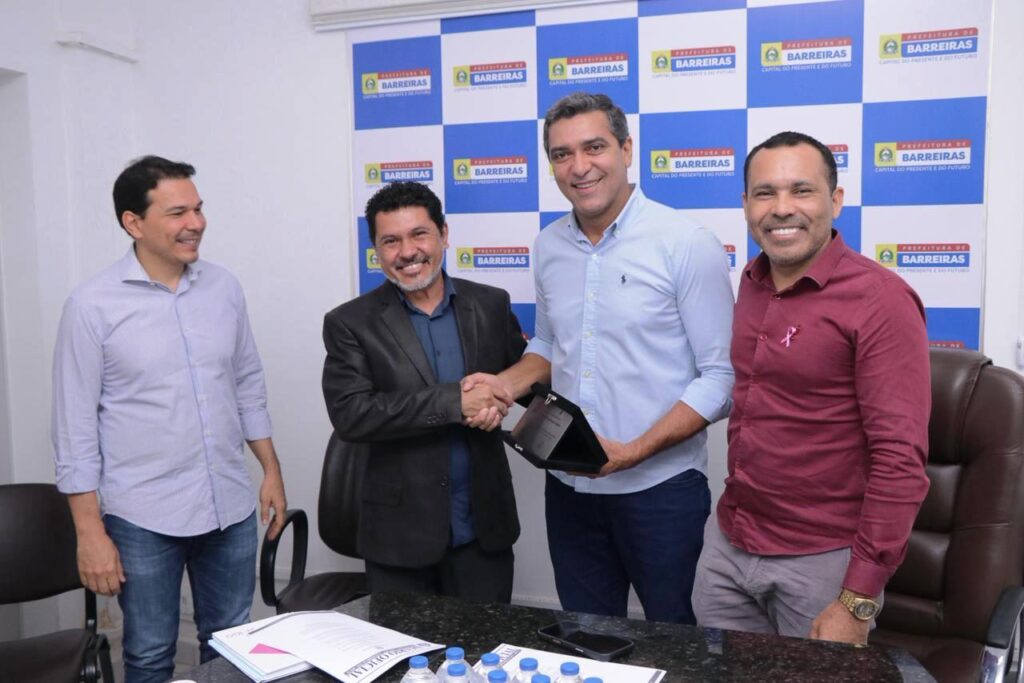 Em reconhecimento ao apoio histórico do município de Barreiras à educação superior, o prefeito Otoniel Teixeira recebeu nesta terça-feira, 14 de outubro, uma Menção de Agradecimento da Universidade Federal do Oeste da Bahia (UFOB). A homenagem foi entregue pelo reitor Jacques Miranda e pelo vice-reitor Antônio Oliveira de Souza, durante visita ao gabinete do prefeito, acompanhados pelo vice-prefeito Túlio Viana e por todo o secretariado municipal.