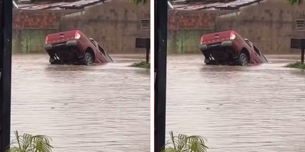Na manhã desta quinta-feira (27), fortes chuvas atingiram a cidade de Luís Eduardo Magalhães. Durante o temporal, ruas ficaram alagadas e uma picape ficou parcialmente submersa após cair em um buraco. De acordo com informações, duas pessoas estavam dentro do veículo, mas conseguiram sair pela janela e não ficaram feridas.